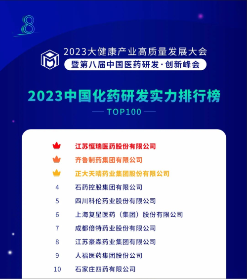 由药智网、中国药业杂志社主办的2023大健康产业高质量发展大会暨第八届中国医药研发•创新峰会于6月16日开幕,会上发布了《2023中国药品研发实力排行榜》系列榜单,AG旗舰厅医药凭借深厚的创新研发实力再创辉煌:荣登《2023中国药品研发综合实力排行榜TOP100》榜首、《2023中国化药研发实力排行榜TOP100》榜首。值得一提的是,今年是AG旗舰厅医药连续第6年入选《中国药品研发综合实力排行榜》榜首。